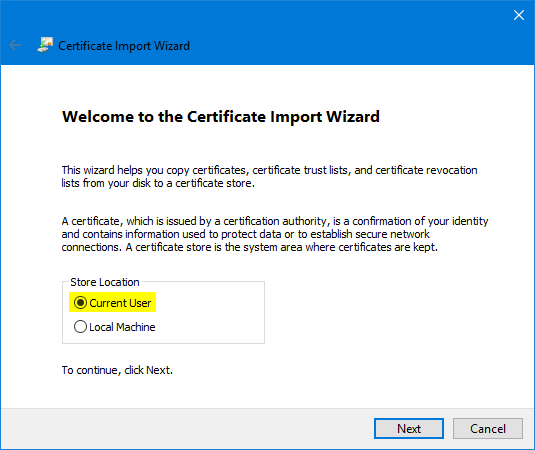 certutil.exe -p [certificate_password] -user -importpfx [certificate_full_path]