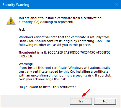 - Anda akan mendapatkan peringatan keamanan yang menunjukkan bahwa sertifikat EFS yang ditandatangani sendiri tidak ditandatangani dari otoritas tepercaya. KlikYauntuk melanjutkan.