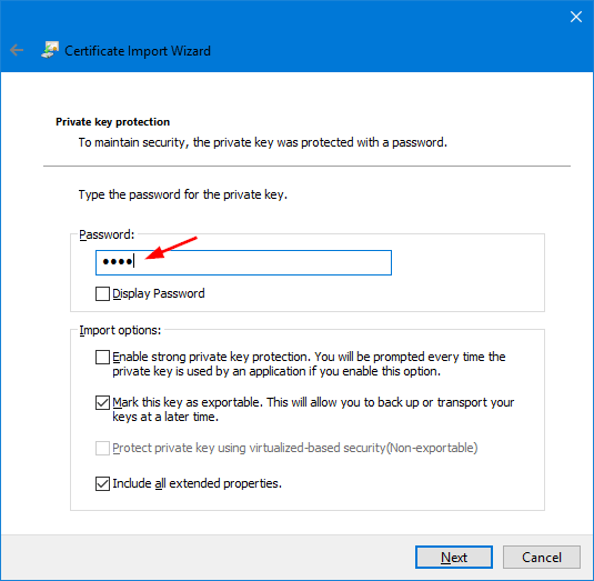- Masukkan kata sandi untuk mengakses kunci pribadi yang terkait dengan sertifikat EFS. Pilih kotak "Tandai kunci ini sebagai ekspor. Ini akan memungkinkan Anda untuk mendukung atau mengangkut kunci Anda di lain waktu“. KlikBerikutnya.