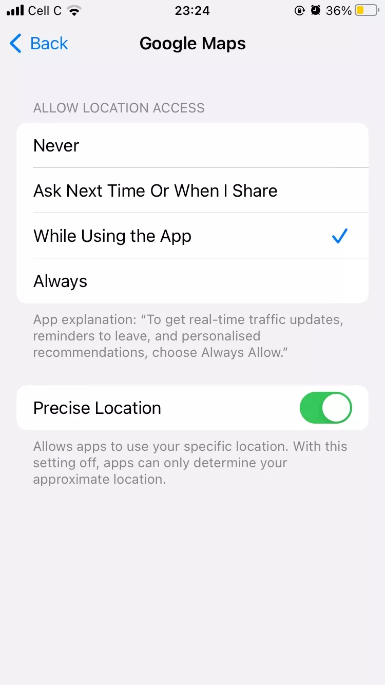 - PilihSaat menggunakan aplikasiOpsi untuk memastikan Google Maps tidak mengakses data lokasi Anda saat Anda tidak menggunakan Google Maps.