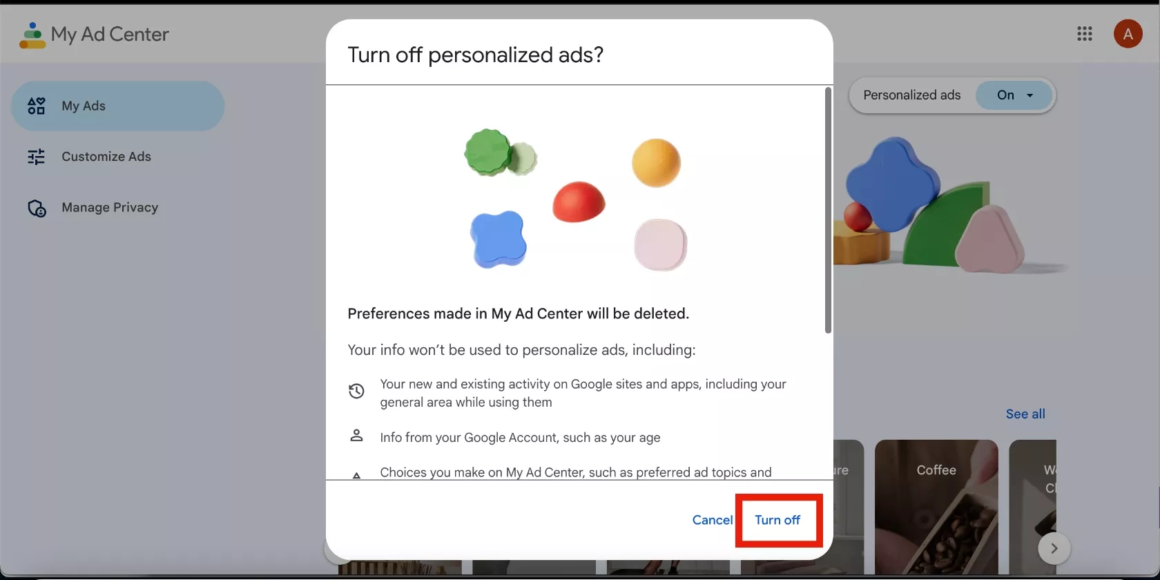- Anda akan mendarat diIklan sayatab Secara default. Jika tidak, pilihnya di bilah samping dan klikIklan yang dipersonalisasi> Matikan.