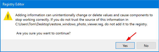 - KlikYaUntuk mengonfirmasi bahwa Anda ingin menambahkan kunci registri.