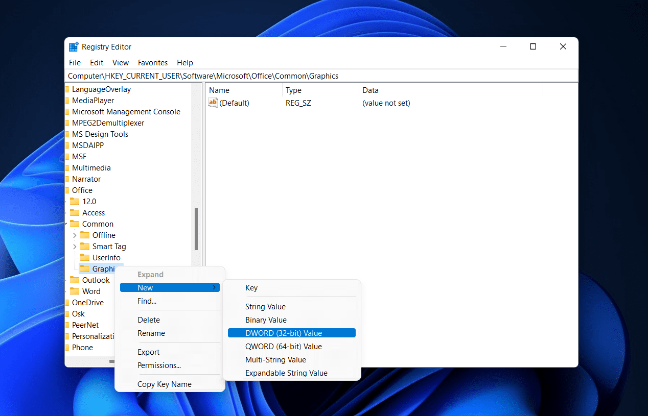 • Selanjutnya, klik kanan diGrafikdi bilah sisi kiri. Klik padaBaruDari menu dan kemudian klikNilai DWORD (32-bit). NamaNilai DWORD (32-bit)sebagaiDisableHardWareacceleration.