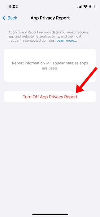 Laporan Privasi Aplikasi mencatat akses data dan sensor, aktivitas jaringan aplikasi dan situs web, serta domain yang paling sering dihubungi di latar belakang, yang memengaruhi kinerja baterai. Oleh karena itu, jika masalah pengurasan baterai masih belum teratasi, Anda juga dapat mencoba menonaktifkan Laporan Privasi Aplikasi.