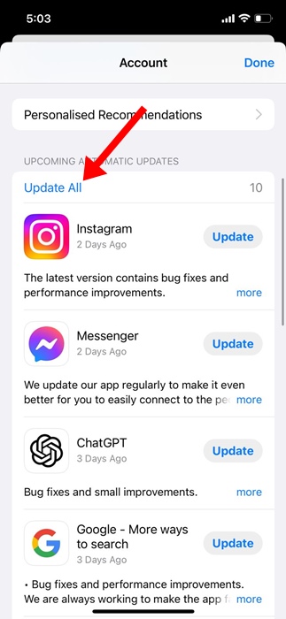 Ini akan memperbarui semua aplikasi di iPhone Anda. Setelah pembaruan, pastikan untuk me-restart iPhone Anda.
