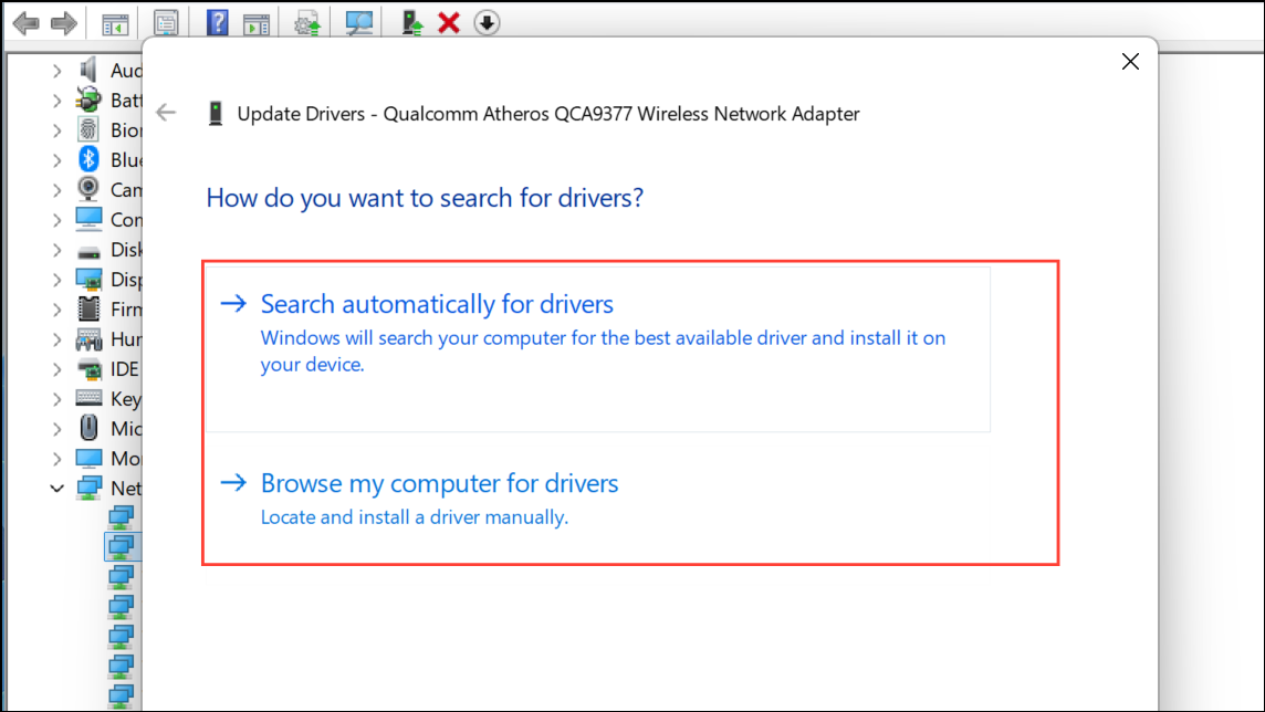 Langkah 3:PerluasNetwork adaptersbagian, klik kanan perangkat wifi Anda, dan pilihUpdate driver. MemilihBrowse my computer for driversJika Anda mengunduh driver secara manual, atauSearch automatically for driversuntuk cek cepat.