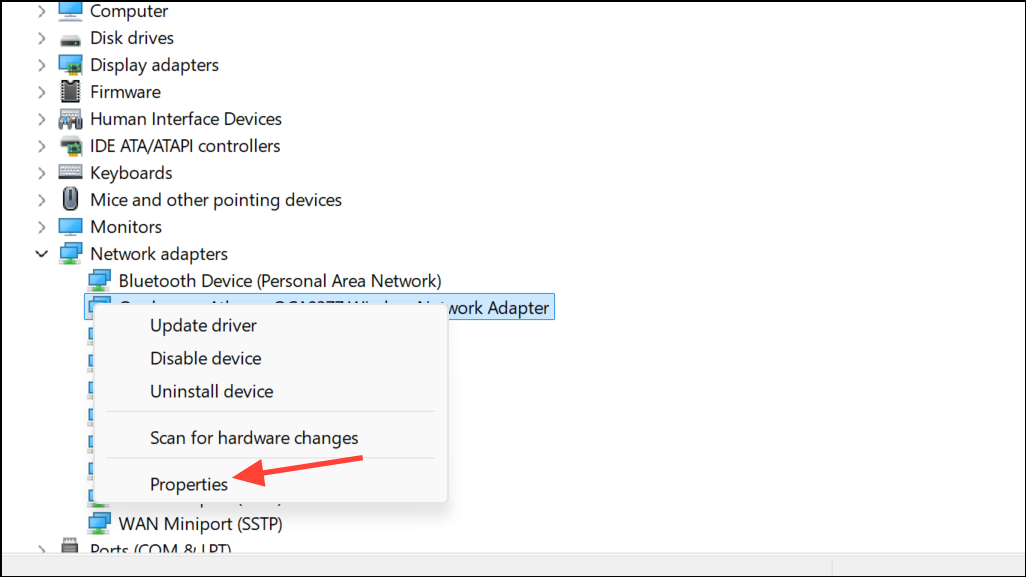 Langkah 1:Kembali keDevice Manager, klik kanan adaptor wifi Anda, dan pilihProperties. Arahkan keAdvancedtab.