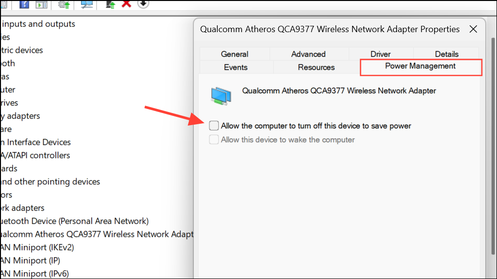 Langkah 2:Pergi kePower Managementtab. Hapus centangAllow the computer to turn off this device to save power. Pengaturan ini dapat menyebabkan Windows menonaktifkan adaptor WiFi selama periode tidak aktif atau penggunaan sumber daya yang tinggi, menghasilkan pemutusan yang tidak terduga - terutama pada laptop.