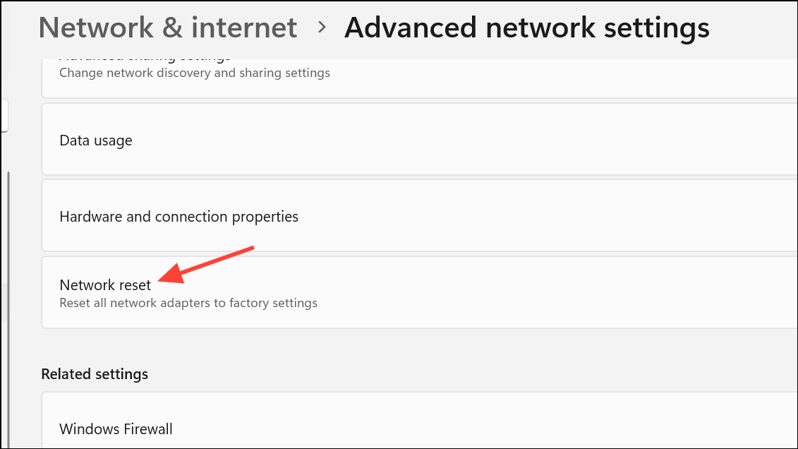 Langkah 1:MembukaSettings > Network & Internet > Advanced network settingsdan pilihNetwork reset. Ini akan menghapus dan menginstal ulang semua adaptor jaringan, membersihkan konflik atau pengaturan yang rusak yang diperkenalkan oleh pembaruan.