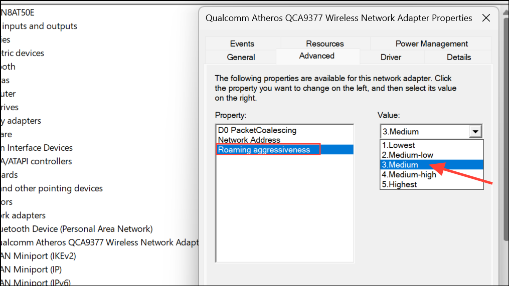 Langkah 2:Sesuaikan pengaturan sepertiRoaming Aggressiveness(diatur keMediumatauLowestuntuk mengurangi perpindahan yang tidak perlu antar jaringan) danWireless Mode(Cocokkan dengan kemampuan router Anda, misalnya, 802.11ac atau 802.11ax). Penyesuaian ini dapat menstabilkan koneksi Anda dengan mencegah adaptor mencari jaringan baru atau menggunakan standar nirkabel yang tidak kompatibel.