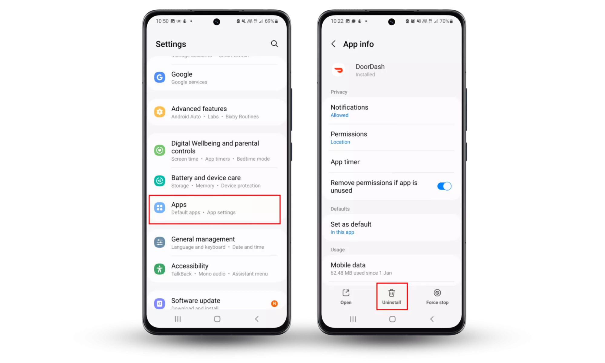 ขั้นตอนที่ 1-2: การตั้งค่า > แอป > เลือกแอป > ถอนการติดตั้ง3. ลบแอปพลิเคชันที่ติดไวรัส