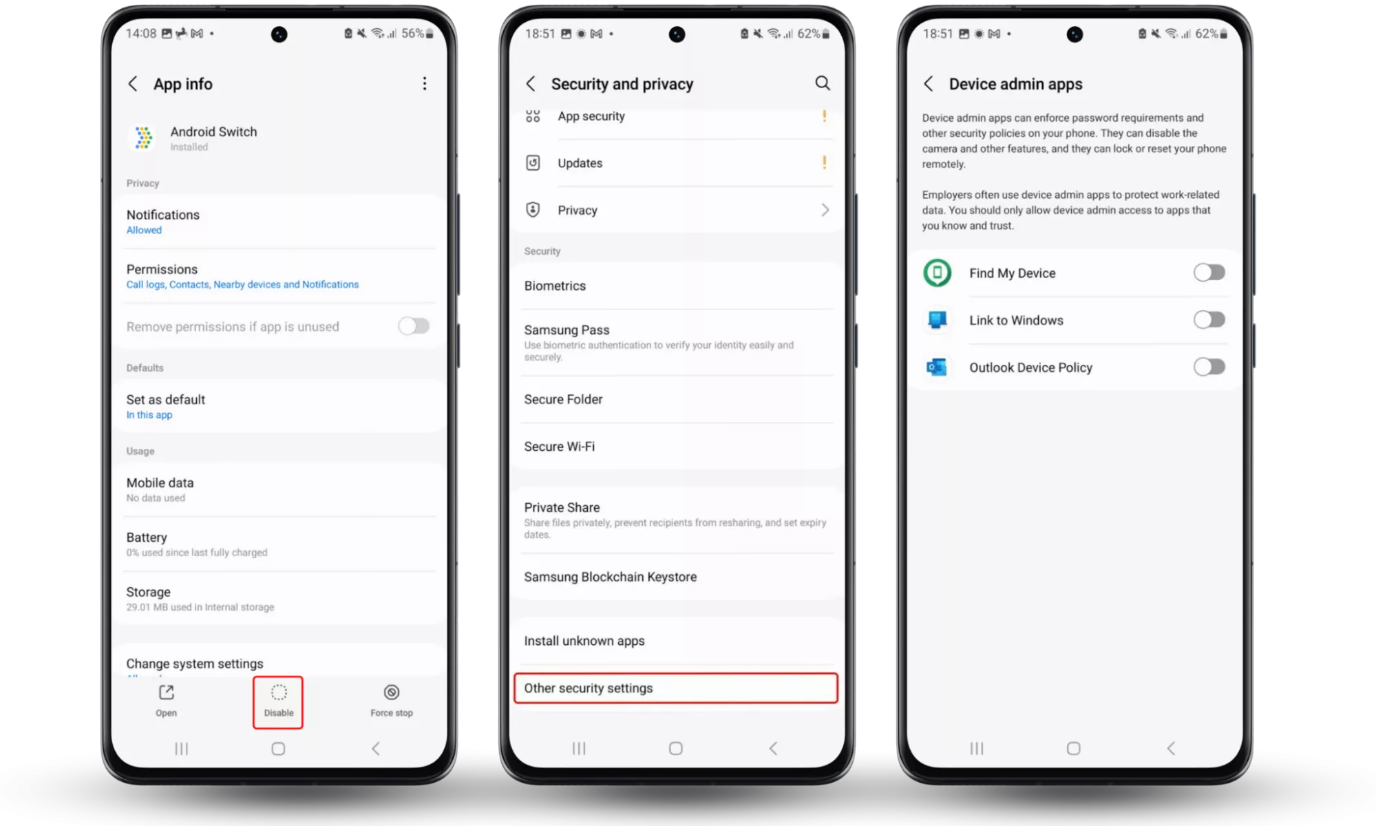 - แตะแอพผู้ดูแลระบบอุปกรณ์- ค้นหาผู้บุกรุกในรายการและปิดปุ่มสลับที่อยู่ข้างๆ สวิตช์ควรเปลี่ยนเป็นสีเทา ตอนนี้คุณสามารถถอนการติดตั้งแอปได้ตามปกติ