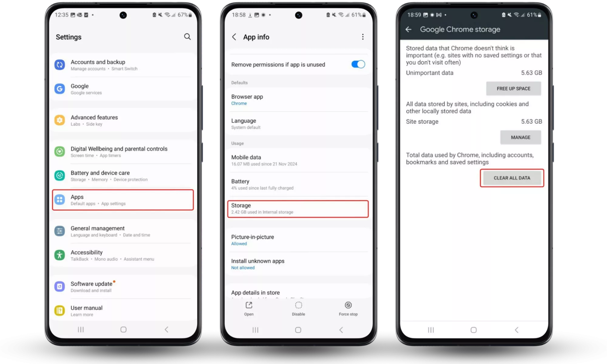 ขั้นตอนที่ 1-3: การตั้งค่า > แอป > Chrome > พื้นที่เก็บข้อมูล > จัดการพื้นที่เก็บข้อมูล > ล้างข้อมูลทั้งหมดล้างการดาวน์โหลดของคุณ