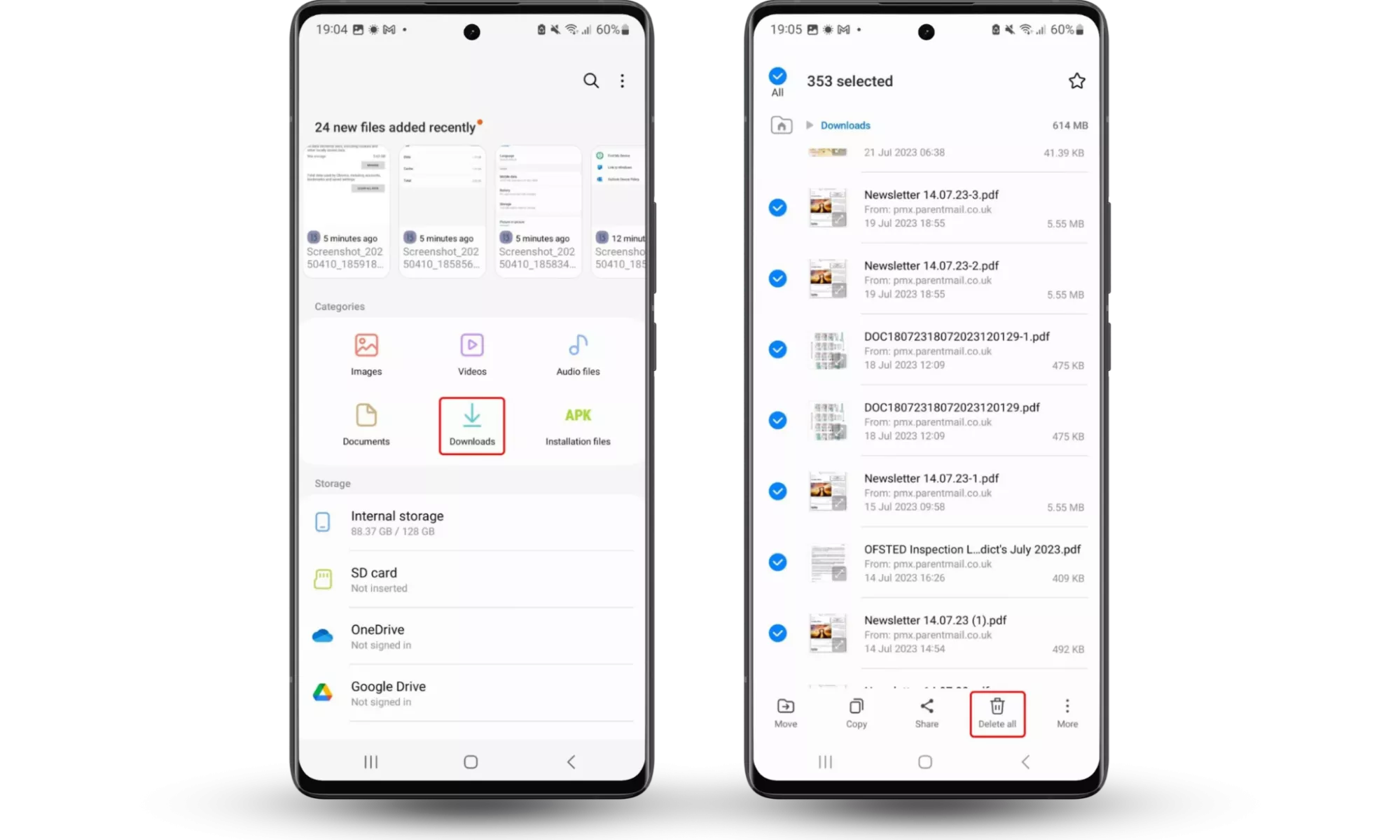 ขั้นตอนที่ 1-2: ไฟล์ > ดาวน์โหลด > กดแบบยาว > เลือกทั้งหมด > ลบทั้งหมดติดตั้งแอปป้องกันมัลแวร์บนมือถือ