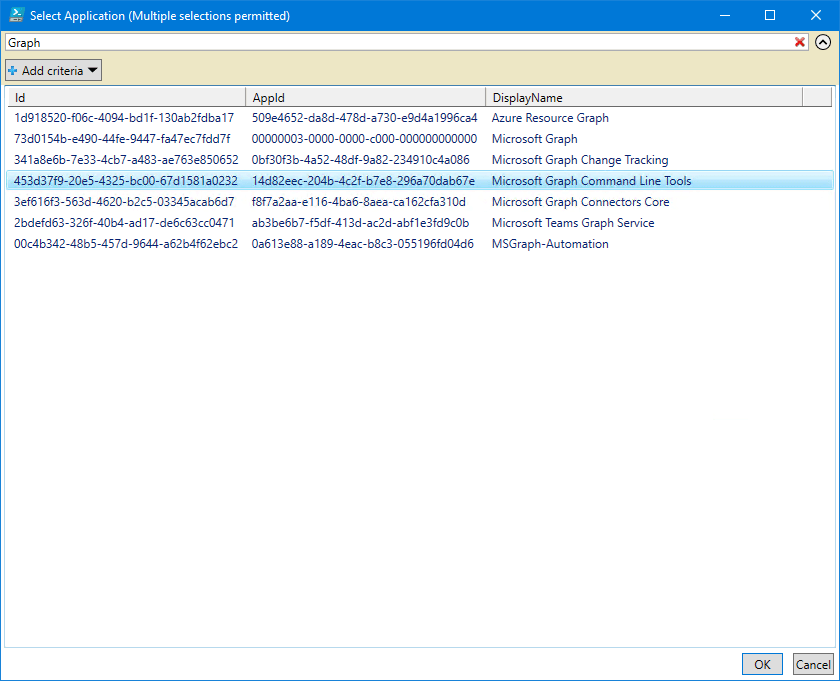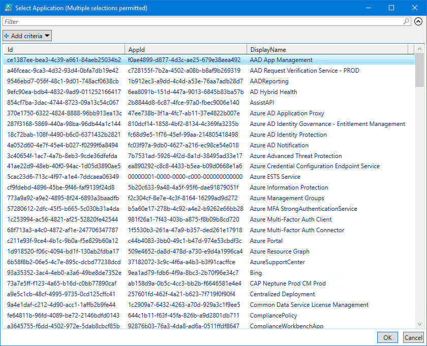 $results = Get-MgServicePrincipal -All | Select-Object Id, AppId, DisplayName | Sort-Object DisplayName | Out-GridView -PassThru -Title "Select Application (Multiple selections permitted)"