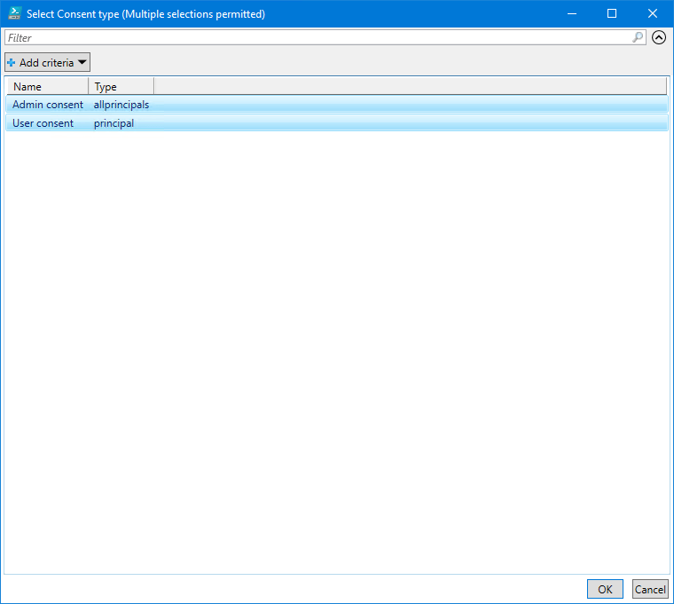 $consentSelects = $consentType | Out-GridView -PassThru -Title "Select Consent type (Multiple selections permitted)"