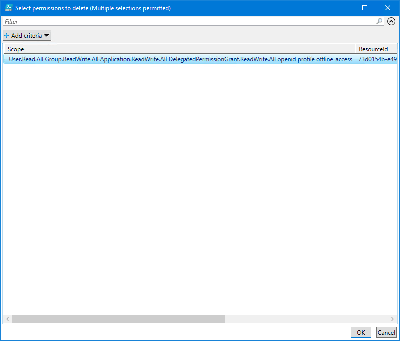 $removes = $infoScopes | Select-Object Scope, ResourceId, Id | Out-GridView -PassThru -Title "Select permissions to delete (Multiple selections permitted)"