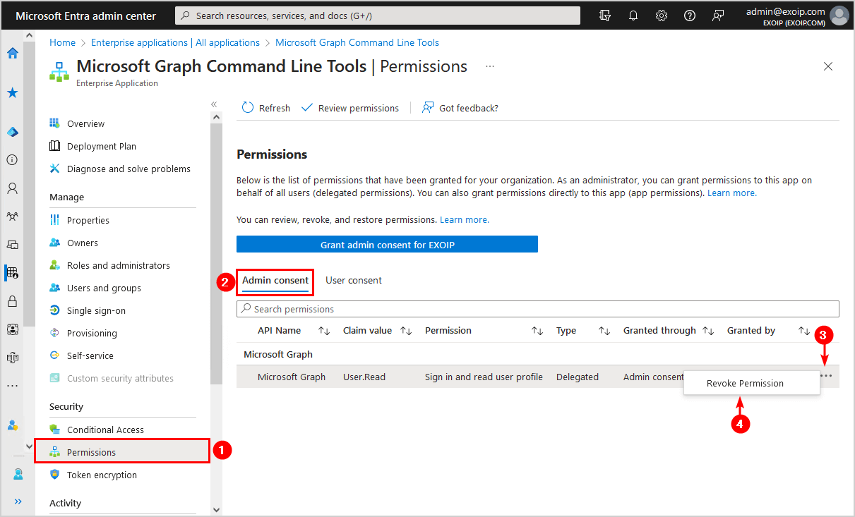 ดังนั้นเราจึงสามารถเพิกถอนการอนุญาตจากแอปพลิเคชันได้เมื่อได้รับความยินยอมจากผู้ดูแลระบบ น่าเสียดายที่เป็นไปไม่ได้ที่จะเพิกถอนสิทธิ์เมื่อได้รับความยินยอมจากผู้ใช้ในศูนย์การจัดการ Microsoft Entra