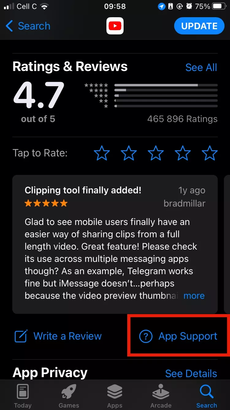 - เลื่อนหน้าลงจนกว่าคุณจะเจอการให้คะแนนและบทวิจารณ์ส่วนและแตะการสนับสนุนแอพด้านล่าง สิ่งนี้จะนำคุณไปยังหน้าสนับสนุนซึ่งคุณสามารถฝากข้อความที่อธิบายปัญหาของคุณและส่งข้อมูลตามคำแนะนำ