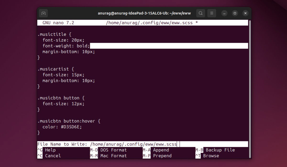 คุณกำหนดวิดเจ็ต ซึ่งเหมือนกับเทมเพลตหรือส่วนประกอบ และหน้าต่าง ซึ่งเป็นคอนเทนเนอร์หรือพื้นผิวที่วิดเจ็ตวางอยู่ในไฟล์กำหนดค่า Yuck สำหรับการจัดแต่งทรงผม EWW ใช้ CSS/SCSS ใช่แล้ว CSS ประเภทเดียวกับที่ใช้จัดรูปแบบหน้าเว็บ