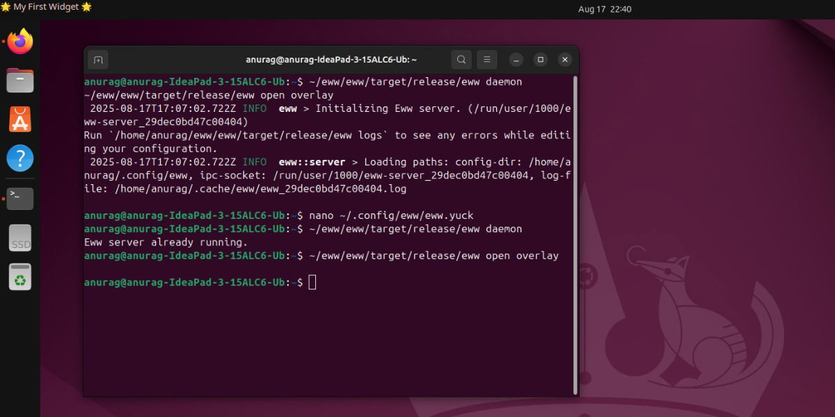 อีดับย่อมาจาก Wacky Widgets ของ ElKowar และอย่างที่ชื่อบอก มันเป็นระบบวิดเจ็ตสำหรับเดสก์ท็อป Linux EWW ช่วยให้คุณสร้างและแสดงวิดเจ็ตที่กำหนดเองบนเดสก์ท็อปของคุณ สิ่งต่างๆ เช่น นาฬิกา การตรวจสอบระบบ ข้อมูลสภาพอากาศ การควบคุมเพลง และอื่นๆ อีกมากมายที่คุณนึกออก และไม่ขึ้นอยู่กับสภาพแวดล้อมเดสก์ท็อปหรือตัวจัดการหน้าต่างใดๆ
